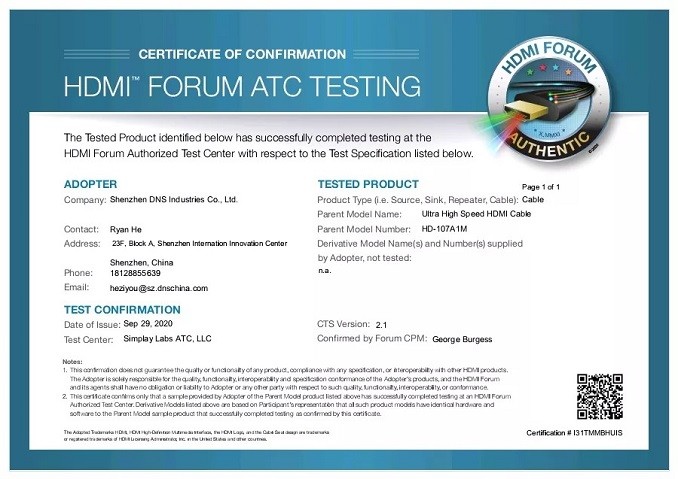 DNS于2020年9月29日获得了HDMI协会颁发的HDMI 2.1认证证书,成为首批获得UHS线缆认证制造商之一。
